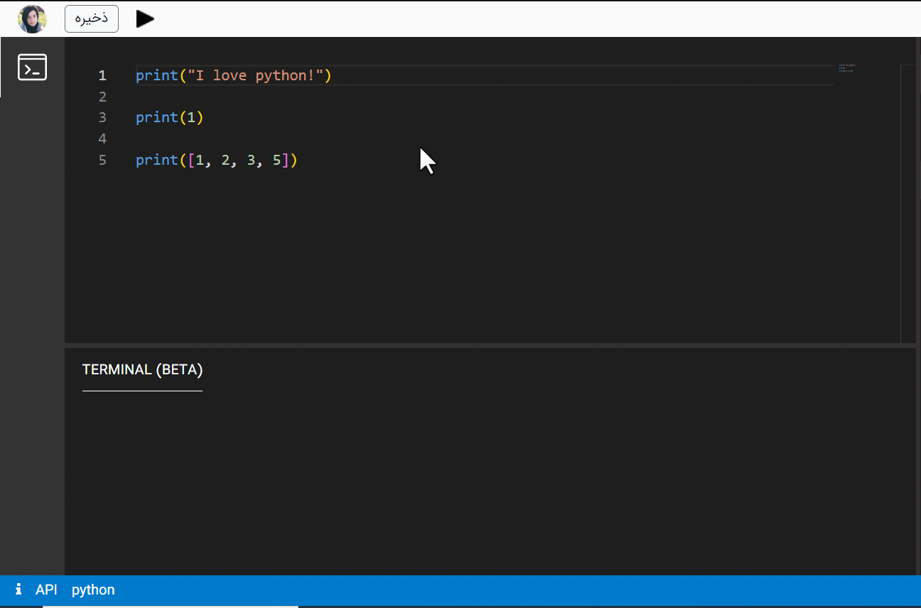 در پایتون برای چاپ متن، عدد، لیست یا هر نوع داده دیگری در خروجی، از دستور ()print استفاده می شود. print یک تابع است که هر مقداری بین دو پرانتزش دریافت کند را در خروجی نمایش میدهد. در مورد توابع در بخش مخصوص خود بیشتر صحبت میکنیم.
